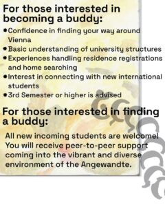 Starting at a new university might sometimes feel overwhelming, especially when you’re arriving from another country… We, at the Angewandte Student Union (HUFAK)’s International Students and Anti-Racism Department, know that it is not easy to find your way through new systems, cultures, and expectations all at once, and that’s exactly why we are now launching a new Buddy Programme for the Angewandte students.